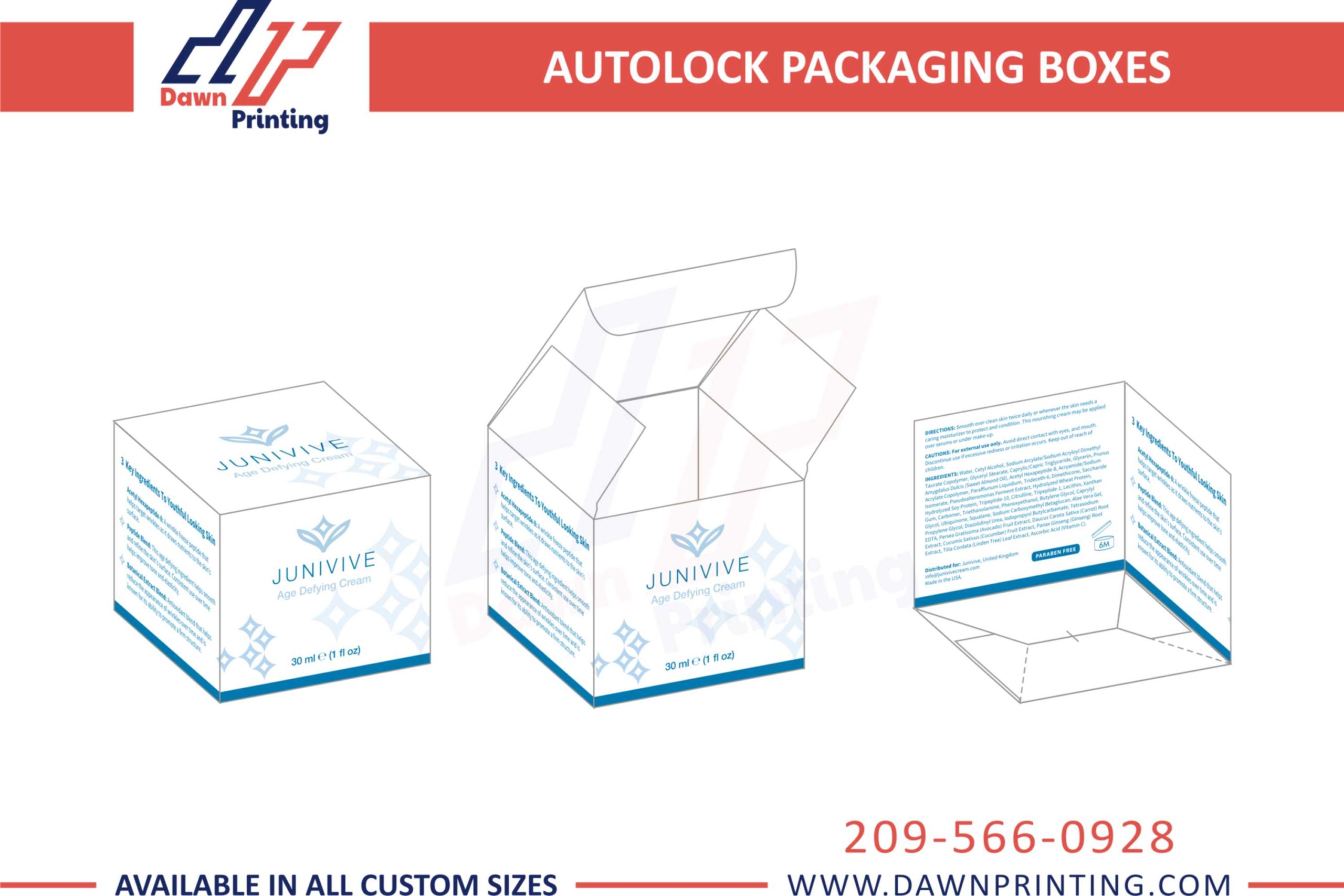 With an Auto lock mechanism and spacious interior areas, auto-lock packaging is dependable. Custom Auto lock bottom boxes area unit ideal for storing natural philosophy, cosmetics, groceries, medications, presents, and different retail things.