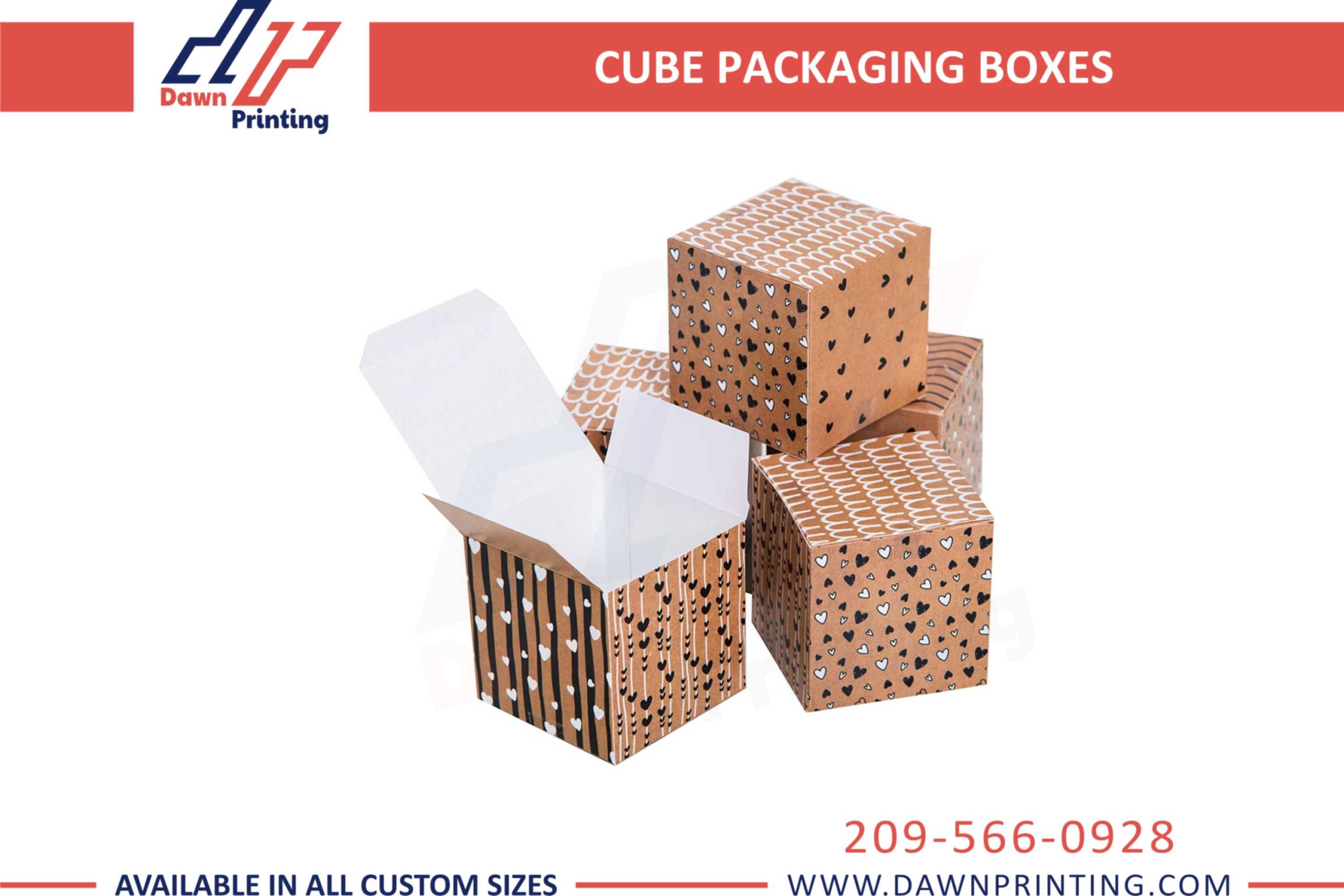 Which brand are you running? Cosmetics? Electronics? Household? Jewelry? It doesn’t really make a difference because cube boxes are compatible with almost every product. These boxes are versatile and this is what makes them interesting. Now, for example in cosmetics, beauty creams, hair gels, massage creams, and such products are packaged in cube boxes. They are even being used widely as gift boxes by beautifully packing the product in and wrapping a ribbon around the box. The beauty of the packaging is what matters the first for your customers, only then will they get engaged with your products. You are not limited to staying with the existing cube box style when you’re working with us. We offer you to personalize your cube packaging boxes as you desire using our wide range of provided facilities at Dawn Printing.