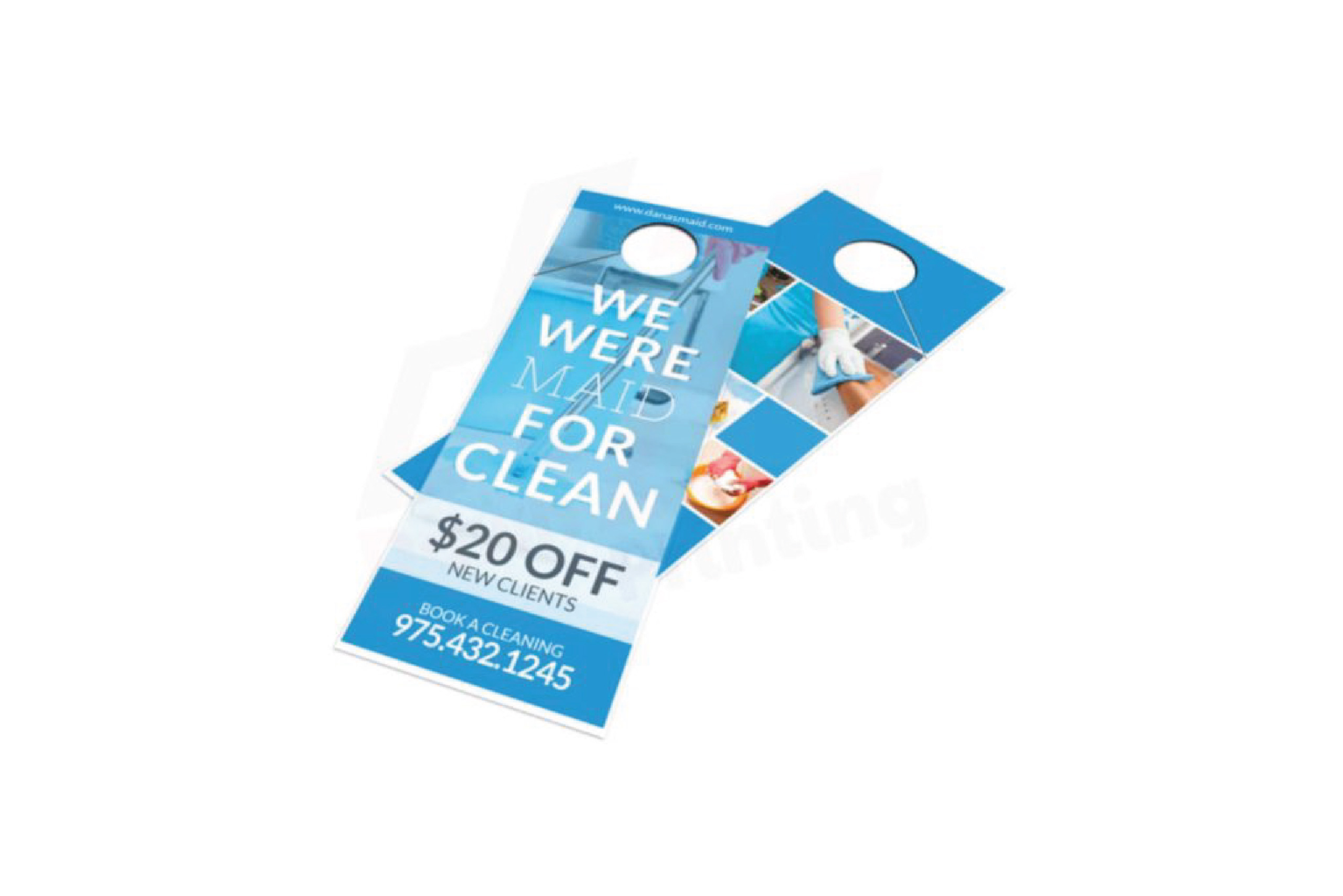 Don’t you want to market your brand effectively? Then don’t hesitate to buy the door hangers from us. They will work the best for you whether you have a pizza store, a bakery, restaurant, cafe, etc. No matter what the type of your business is, door hangers are going to be of your assistance in getting you on top. Being simple cards, they can do wonders. Are you running offers? Great! Use door hangers to promote them. Door hangers are hanged on the door latch or handle. Every customer that will visit your store will obviously open the door first to get in. The first-ever thing that they will see before entering your store is the door hanger. Even if someone visits your store for the first time ever, our custom door hangers will tell them that your store is awesome with their splendid looks.  Let us tell you how printed door hangers are made. You have already noticed in the above images that they are simple cards with a hole that allows them to hang on the doorknob. Now, we know exactly what’s going on in your mind. No, you won’t get the same shape and design if you ask us for door hangers. This is what our peculiarity is! The one design you’re seeing in the above images is just a sample. There are more attractive designs of door hangers available at Dawn Printing. However, this is not all as well. We also give you complete authority to make up your own door hangers just the way you want. Now, it depends on you whether you want it to be sophisticated or a little entertaining. We will make the printed door hanger for you!