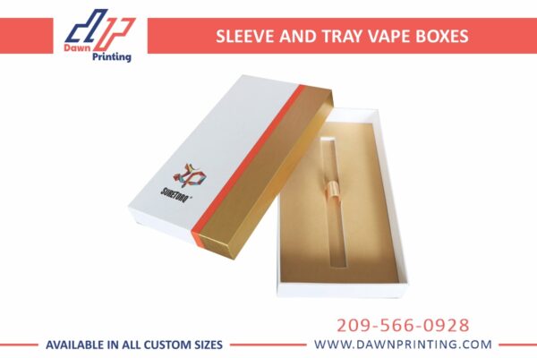 Our premium Sleeve and Tray Vape Packaging Boxes, the ultimate answer for organizing and safeguarding your vaping essentials. At our agency, Dawn printing offer an extensive variety of services to cater to your particular needs. With our unfastened templates, designing your custom vape boxes has never been simpler. We also offer free shipping, making sure your orders reach you promptly and hassle-free. Whether you require wholesale quantities or short-run boxes. Our experienced crew is devoted to handing over top-notch exceptional work with speedy turn-around instances to meet your closing dates.