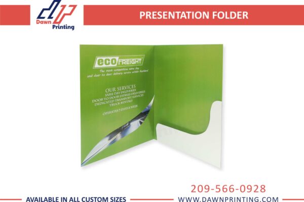 Increase your level of presentations with the quality looks of our paper presentation folders. We ensure you the business you wish to get through these awesome folders. Dawn Printing makes them with extreme care since your brand value depends on them. We give our paper presentation folders a luxurious shape with beautiful graphics in order to entice customers and other onlookers. You can make them even more appealing using our provided facilities. Provide us your designed artwork that you want to print on the paper presentation folders using the CMYK or PMS model. To boost the appearance of these folders, make use of our design techniques. Are you interested in letting your business climb heights? Place your order for wholesale presentation folders. Call us or get a free quote now!